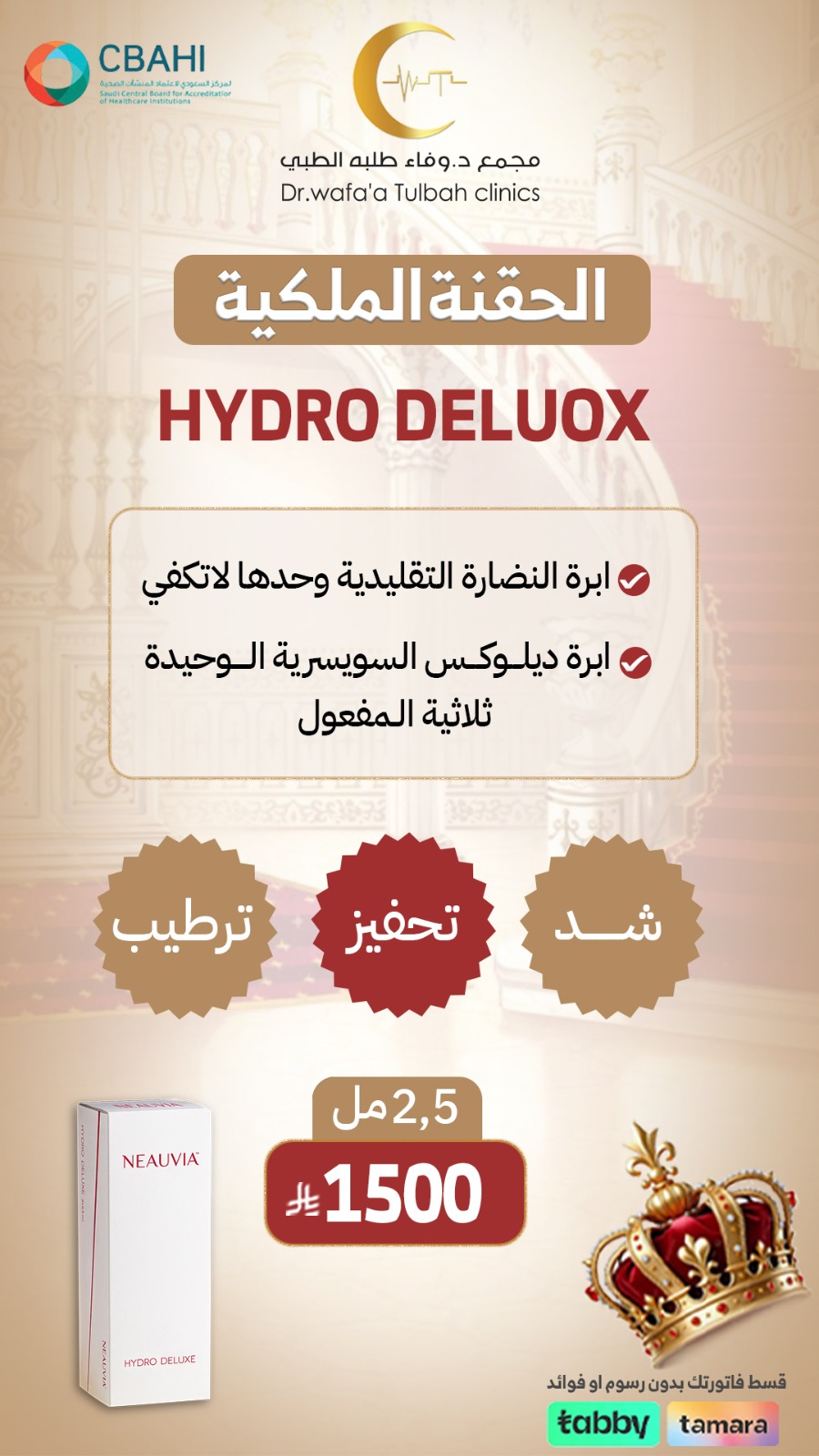 علاج هايدرو ديلوكس المتكامل للبشرة يجمع بين الترطيب العميق، تحفيز الكولاجين، والشد الفوري باستخدام تقنيات سويسرية متطورة.
