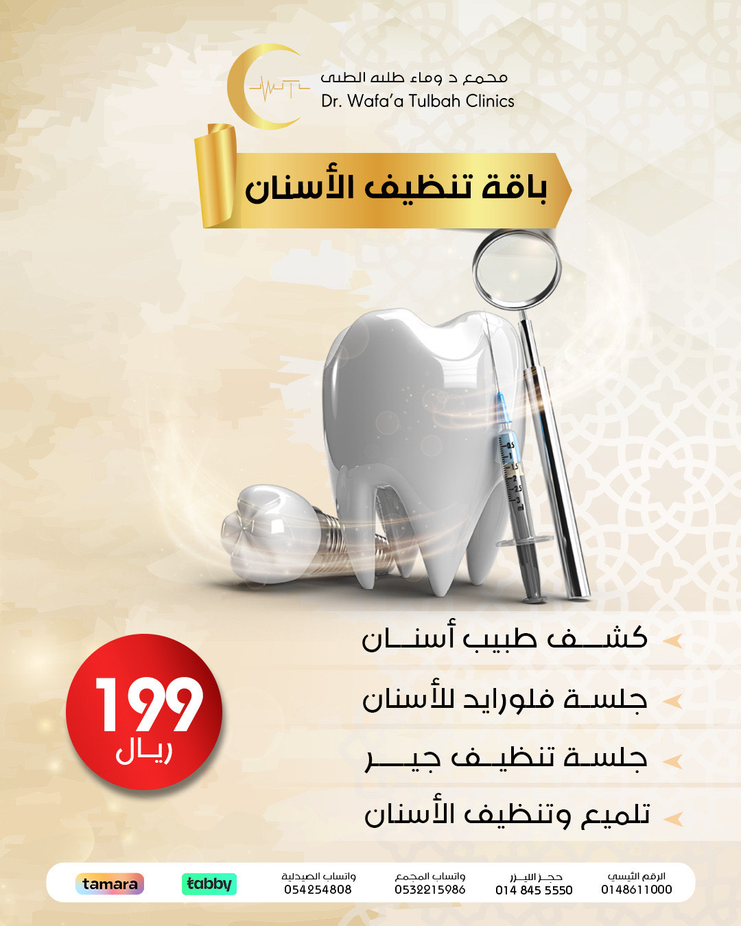 “نظف أسنانك باحترافية بسعر 199 ريال فقط! الباقة تشمل الفحص، الفلورايد، إزالة الجير، والتلميع. احجز الآن لابتسامة أكثر صحة وإشراقاً.”